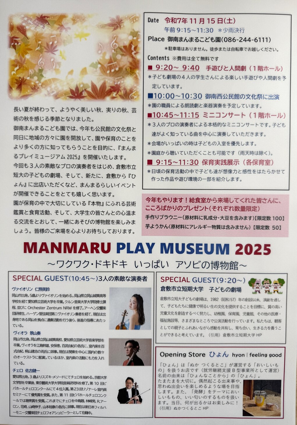 11月15日(土)午前9:15~御南まんまるこども園にて、子ども達を対象にしたワクワク・ドキドキいっぱいアソビの博物館『まんまるプレイミュージアム』を開催します。楽しい企画がいっぱいのプレイミュージアム!園児の皆さんも、小学生も、地域の子ども達も、お家の方と一緒に園に遊びに来てくださいね。皆さんのお越しをお待ちしています。